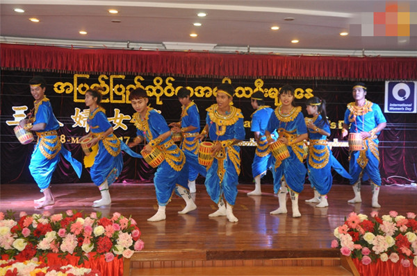 随后,欢庆会在各个妇女会的表演中正式拉开帷幕,整场欢庆会节目精彩纷呈,妇女会代表们的缅甸舞蹈、少数民族舞蹈、斗笠舞……,优美的旋律、柔美的舞姿、精美的缅族服饰让台下观众大饱眼福,妇女舞蹈队带来的精彩表演不断地将现场欢庆的气氛推入高潮。据悉,此次庆祝三八节活动于凌晨6点开始,金多堰妇女慈善会请了11位高僧及10位尼姑,念经并供奉早餐,并为妇女同胞专设女性购物商铺,商铺商铺人头攒动,热闹而喜庆。主办方以此具有浓厚缅甸传统习俗的活动安排充分地让妇女同胞们感受到了“国际三八妇女节”的特有意义及给人们度过了一个健康、和谐、快乐而有意义的节日。