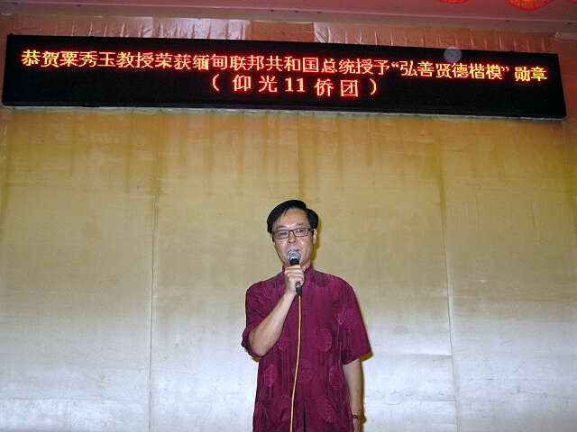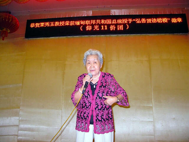 仰光十一侨团4月2日下午六时假座梅花皇后大酒家联合祝贺粟秀玉教授荣获缅甸联邦共和国总统吴登盛授予"弘善贤德楷模"勋章和证状。中国驻缅甸大使馆文化参赞王瑞青及夫人、领事部张鹏秘书及夫人、新华社仰光分社张云飞主任、缅中友协会秘书长吴梭温以及各侨团代表共一百多人。