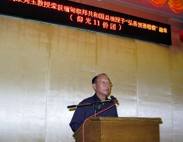 缅甸福建同乡总会会长吕振膑先生致欢迎词,他首先祝贺粟秀玉老师荣获"弘善贤德"勋章,并说粟秀玉为中缅友好作了大量工作,在学术上精益求精,受到缅华社会各界所敬重。接着王参赞讲话,并用二胡拉了三首歌曲献予粟秀玉教授,粟秀玉教授、吴梭温也相继讲了话。
