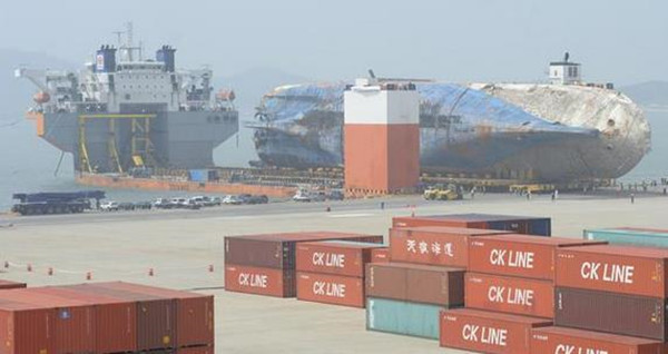 当地时间2017年4月9日,韩国全罗南道木浦新港,据韩联社报道,韩国海洋水产部9日表示,9时启动“世越”号上岸作业。半潜船上排成8列的600辆模块运输车已将“世越”号抬离甲板,9时起开始极为缓慢地水平移动,将在涨潮的13时许次第出水登上码头,运输车全部上岸后要两度转向,将“世越”号卸到码头尽头的支架上,才算实现整体登陆的成功。因沉船重达约1.6万吨,重量分布不均,保持运输车重心稳定是重中之重。“世越”号沉没已有1090天,1周后便是三周年祭。为寻找下落不明的最后9名遇难者遗体,韩国政府还将在沉船内部和沉没海域开展搜索。海洋水产部已在捞起沉船时在附近海底布设长200米、宽160米、高3米防流失铁栅栏。