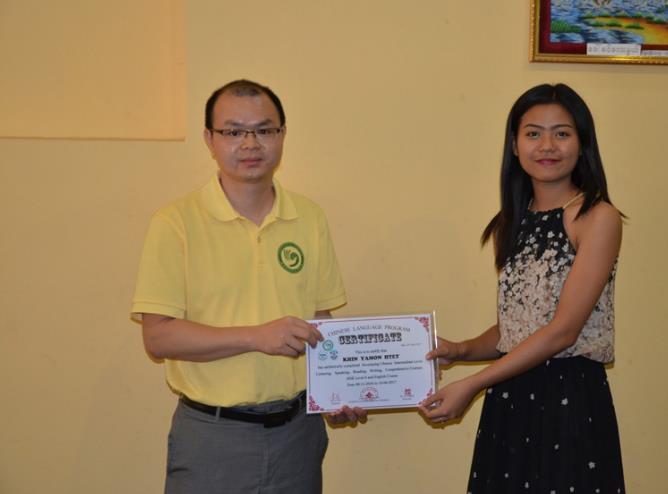 学员代表苏然用流利的中文介绍他们在培训过程中遇到的各种学习困难,遇到困境时的各种努力与拼搏,向奋斗在教学第一线的授课教师的辛苦付出与精心培养表示致谢,对日月关照他们的福庆孔子课堂的相关教师表示致谢,对相互照顾与理解的同学表示致谢。并向中国阳光新闻集团与缅甸亨达媒体集团的领导对学员们的努力付出、投入与精心培养表示深深的谢意。最后代表学员们表示,在福庆孔子课堂培训期间,不仅仅受到了语言方面的训练,在老师们的耐心指导与教诲之下,增长了学习的自信心,学到如何坚持不懈,不管在未来的生活中遇到何种困难,必定会持之以恒,顽强拼搏,保证不辜负所有领导及老师们的期望,鼓起勇气面对学习道路上的各种挫折与困难,为自己的未来努力打拼。