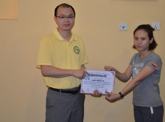 在结业典礼上,首先由黄蕙英老师代表中文授课教师发言,黄老师在发言中提到,虽然在中文培训期间学员们喊苦喊累,遇到很多挫折,但始终坚持下来了,学生们所做出的一切努力都超越了自己的想象。正如中国古话“授人以鱼,不如授人以渔”所论及的道理一样,老师们教会了同学们怎样“钓鱼”的方法,希望他们能自己“钓”到更多的鱼,永远都有鱼吃。也祝福学员们今后的人生中抱着坚持不懈的精神面对未来。英语授课老师Mr. David 在发言中表示,在这么短的培训过程中,学员们付出了辛苦努力,也收获了优异的成绩,对此表示非常欣慰,希望学员们将来像候鸟似的能够在广阔的天空中自由飞翔。