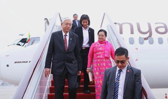 4月6日,缅甸联邦共和国总统廷觉乘专机抵达成都双流国际机场。 中新网记者 付勇胜 摄