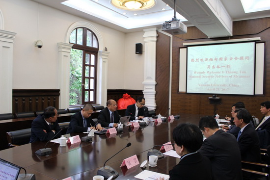 4月21日,缅甸国家安全顾问吴当吞一行到访云南大学,与我校国际关系研究院、周边外交研究中心、缅甸研究院的学者举行座谈交流。出席会议的缅方人员有缅甸国家安全顾问吴当吞、缅甸外交部计划和行政司司长梭林汉、缅甸国家安全顾问办公室处长漆温、缅甸驻昆明总领事吴梭柏,以及云南大学缅甸研究院访问学者吴耶通。中方人员有云南大学副校长杨泽宇教授、国际合作交流处副处长兼孔子学院办公室主任吴芸教授、缅甸研究院院长李晨阳教授、缅甸研究院常务副院长孔建勋教授,以及来自国际关系研究院、缅甸研究院的师生,会谈由李晨阳教授主持。
