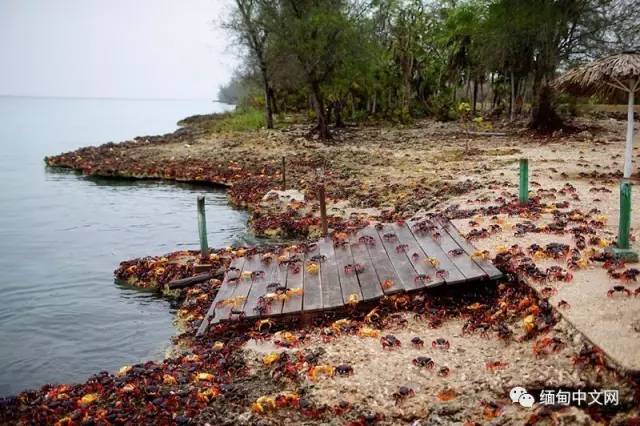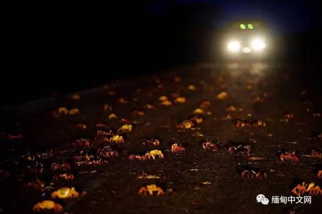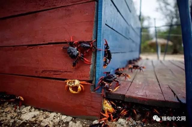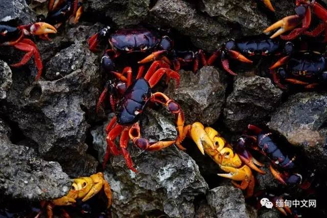 每逢日出日落,这种红黑黄相间的螃蟹便如同百万大军一样,横穿路面。图为岸边的岩石几乎被螃蟹覆盖。