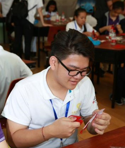 图为缅甸代表团成员学习中国民间剪纸艺术 刘旭 摄