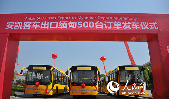 人民网合肥5月10日电(汪瑞华)今天上午,安徽安凯客车出口缅甸的500台公交整装待发,即将亮相仰光街头,为当地市民提供绿色便捷的出行服务。这也是安凯客车继大批量出口沙特、阿尔及利亚等国家之后,在国际市场上取得的又一重大进展。