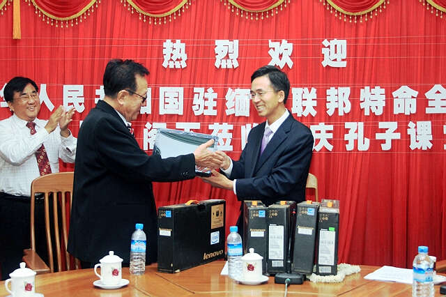 杨大使还为孔子课堂捐赠五台笔记本电脑。显示了大使馆对孔子课堂汉语教学的肯定与支持。