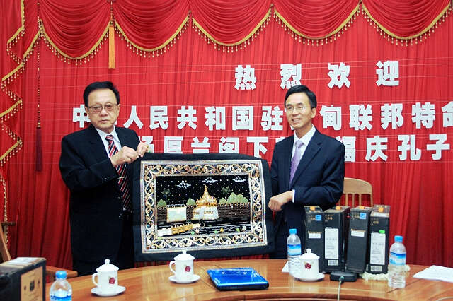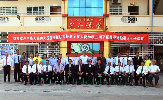 2013年6月12日,下午3时,中国驻缅甸特命全权大使杨厚兰阁下莅临曼德勒福庆孔子课堂参观,并与学校董事会领导及师生进行座谈。会上,首先由福庆学校董事长黄鹏飞先生致欢迎词,并介绍了福庆学校的创业史。福庆孔子课堂中方主任何林教授详细说明了孔子课堂的教学情况,包括孔子课堂汉语教学点的开拓情况;建立“缅中语言文化交流中心”的宗旨方针等等;除此,孔子课堂还计划于今年年底,与中方合作伙伴共同进行一次“中缅文化展”,把缅甸和中国的文化进行对比,向大家展出。何林教授指出,福庆孔子课堂已经由教学型升级为研究型,向前迈进一大步。