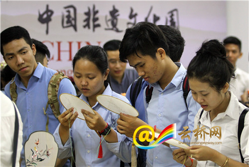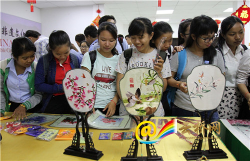 8月1日,“传承与创新——中国非遗展”在柬埔寨中国文化中心举行。18岁的柬埔寨小伙子Phon Bora现场跟中国艺术家一针一线地学起了“汉绣”。他告诉记者“这是我第一次接触汉绣,看起来很精美,它能让人增强耐心。”