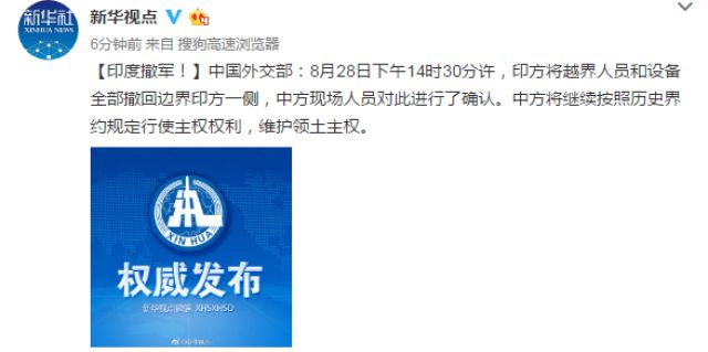 中国外交部:8月28日下午14时30分许,印方将越界人员和设备全部撤回边界印方一侧,中方现场人员对此进行了确认。中方将继续按照历史界约规定行使主权权利,维护领土主权。