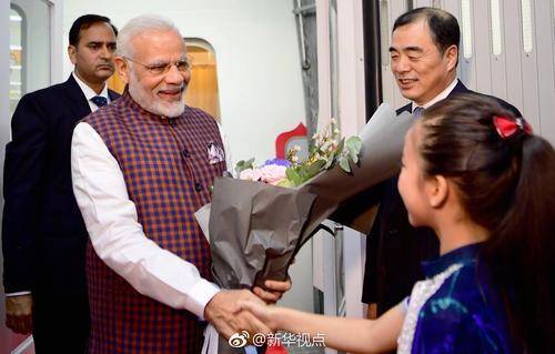 莫迪也是金砖成员国中最后一个抵达厦门的领导人,他的专机着陆时,厦门下起了雨。与其他领导人走下舷梯不同的是,莫迪是通过廊桥接受小朋友献上的花。