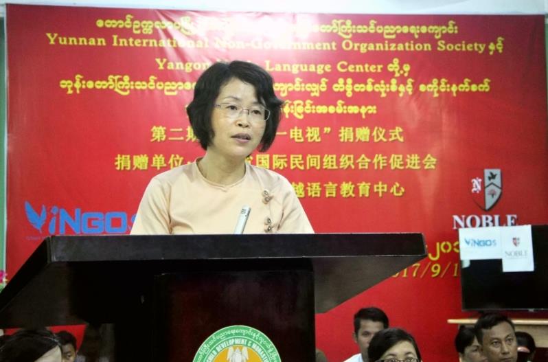 9月18日,第二期“一寺庙一电视”捐赠仪式在仰光敏达谬欧儿童发展中心隆重举行。中国驻缅甸大使夫人王雪鸿、仰光省宗教事务局局长吴盛莫、云南省国际民间组织合作促进会副理事长李荣康、仰光卓越语言教育中心李墨瑶副校长等出席仪式并致辞,接受捐赠的80所寺庙学校的僧尼代表出席仪式。