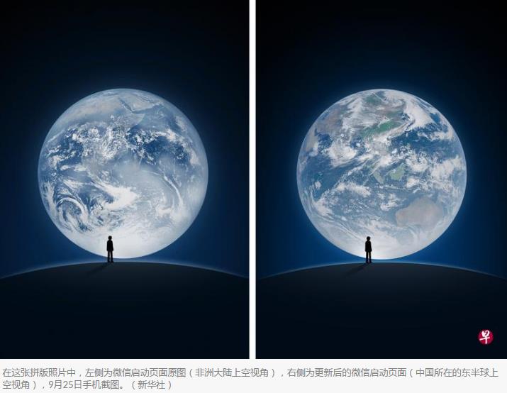 据新华社报道,此次微信启动页面变化后,背景中的地球图片由非洲大陆上空视角,变为中国所在的东半球上空视角,这也是六年来微信启动页面首次发生变化。