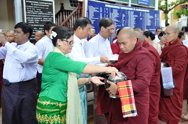 亚洲能源公司董事长贾思义先生及夫人向10位高僧,每位布施缅币十万元以及瓦梭袈裟、僧侣用品等。上午十时,开始布施早膳。