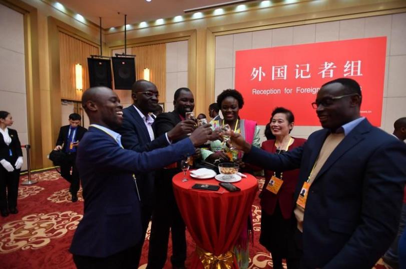 据新闻中心提供的数据,中国十九大受到国际国内媒体的广泛关注,3068名中外记者前来采访报道十九大,其中港澳台记者和外国记者达到1818人,外国记者来自134个国家,遍布世界五大洲。图为酒会现场。