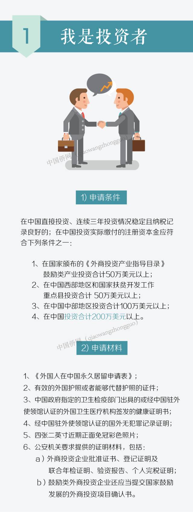 A:根据《外国人在中国永久居留审批管理办法》(2004年发布)的规定,任何满足条件的外国人都可以申请中国永久居留资格。其中对投资类的规定是:在中国直接投资、连续三年投资情况稳定且纳税记录良好。