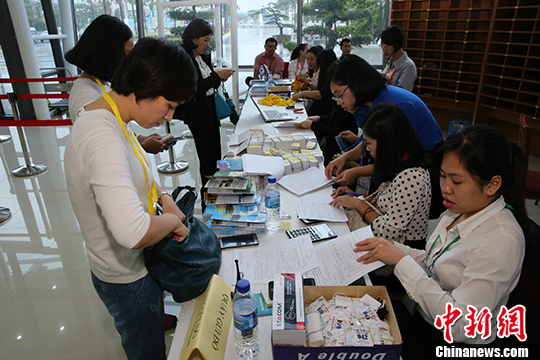 11月5日,记者在APEC国际媒体中心进行注册。 中新社记者 张晨翼 摄