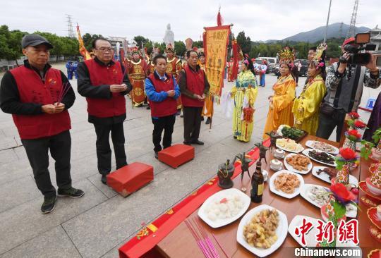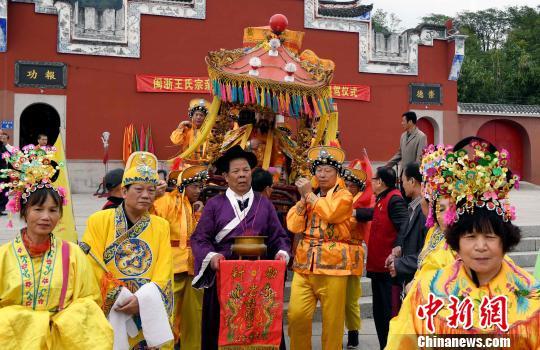 福州市晋安区新店镇莲花山下的闽王纪念馆举行闽王金身起驾仪式。 记者刘可耕 摄