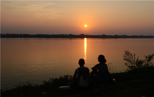 ↑这是2017年5月1日拍摄的游客在老挝甘蒙省他曲市湄公河畔看日落的资料照片。