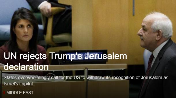 联合国大会周四(21日)以压倒性多数票通过谴责美国承认耶路撒冷为以色列首都的提案。193个成员国,支持美国的只有九国,128国反对,35国弃权,21国没有参与投票。