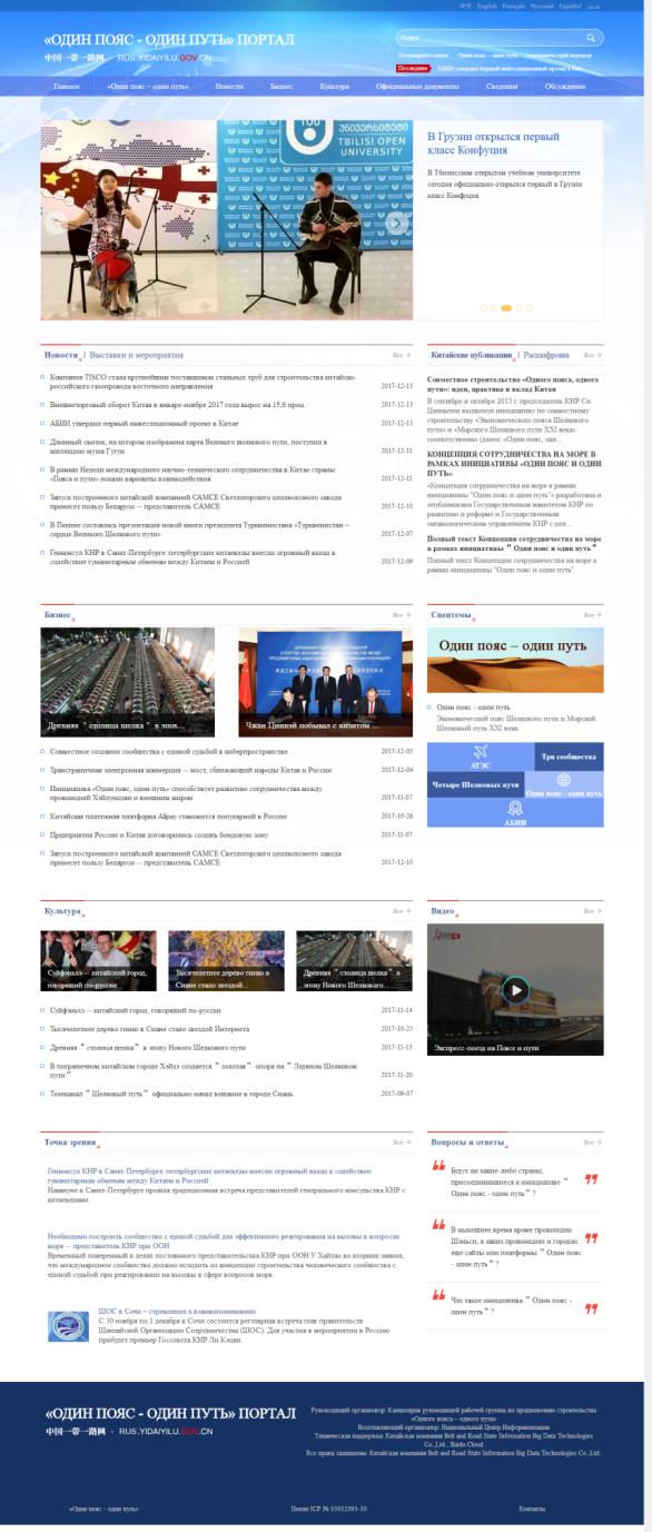 中国一带一路网由推进“一带一路”建设工作领导小组办公室指导、国家信息中心主办,丝路国信大数据技术有限公司、环球网、百度云、安恒信息等提供运营支持。网站自今年3月21日正式上线中文、英文版本以来,在稳步发展中不断创新,已建立了覆盖中央多个部委和全国31省区市的信息报送体系,陕西一带一路网、广东一带一路网等地方网站逐步落地,“一带一路”官方发布体系初见雏形。网站已成为“一带一路”重大政策规划的权威解读平台,重要信息的及时发布平台,企业经贸、人文交流的便利服务平台,共建“一带一路”成果的全面展示平台,受到了海内外用户的广泛好评,并被列入“一带一路”国际合作高峰论坛成果之一。