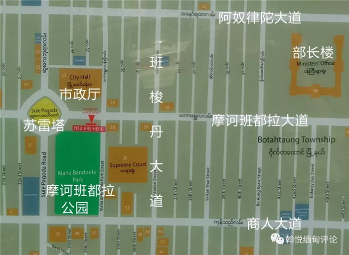 仰光的书店主要集中分布在两大片区,最集中的地方是市中心苏雷塔一带,尤其是班梭丹大道(Pansodan Street)上。两大“文学宫”书店、茵瓦文学社、缅甸书籍中心(Myanmar Book Center,位于Merchant Street, 全部为英文书,极少数为缅文)等都集中于此。