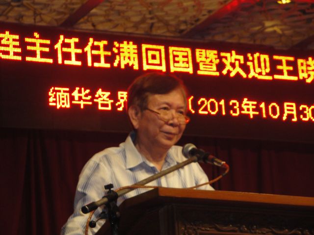 首先,缅甸华商商会会赖松生代表缅华各界致词,接着,杨庆连主任讲话,他首先感谢缅甸华侨华人对他在工作期间给予极大的帮助,给他印象最深的是这里的华侨华人对祖籍国的热情很高,使他很感动。王晓初主任在讲话中也表示要在新的职位里依靠华侨华人,搞好侨务。
