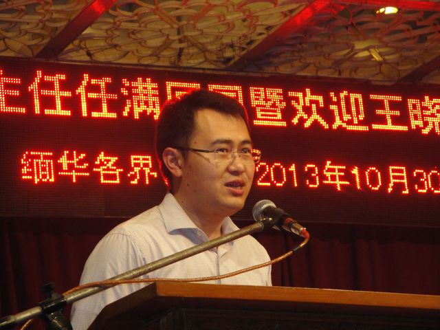 缅华各界侨团于2013年10月30日下午6时在缅甸华商商会礼堂举行联欢宴会,热烈欢送中国驻缅甸大使馆领事部杨庆连主任任满回国,热烈欢迎王晓初主任抵缅履新,陈辰代办、杨庆连主任、王晓初主任、张鹏秘书以及李新娣秘书出席了联欢宴会,缅华各界代表共约150人出席了宴会。