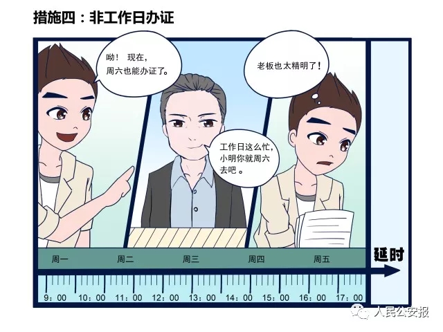 3、“非工作日办证”,为上班族办理证照提供周六、办证高峰以及节假日前延时、错峰受理申请服务;