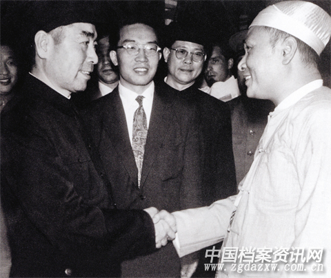 一九五四年六月,周恩来总理访问缅甸时与缅甸总理吴努亲切握手