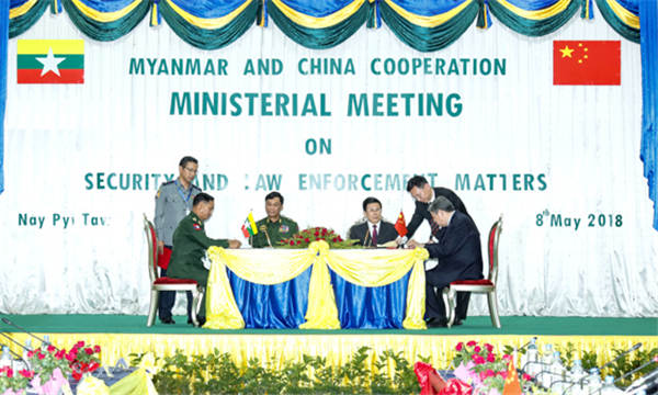 5月8日,国务委员、公安部部长赵克志在内比都与缅甸内政部部长觉瑞举行会谈。图为会谈后,双方签署有关合作文件。