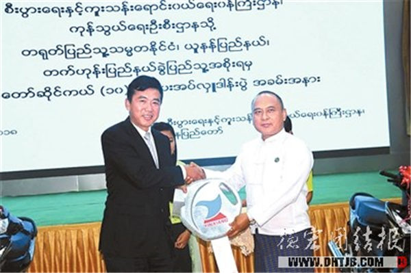 德宏州委书记,瑞丽国家重点开发开放试验区工委书记、管委主任王俊强近日向缅甸商务部捐赠了10辆德宏产“银翔摩托”,缅甸商务部贸易司司长吴阳乃吞代表缅甸商务部接受捐赠。