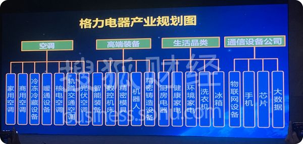 对于此前一直被诟病的手机,董明珠则展示了一副格力电器的产业规划图,规划图显示,格力的产业规划分为四大部分:空调、高端装备、生活品类和通信设备。