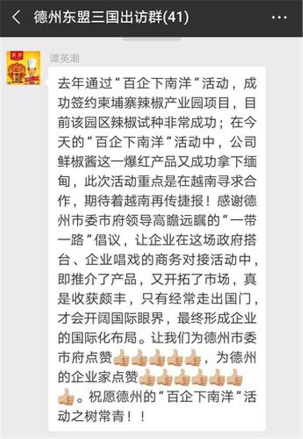 在德州“百企下南洋”微信联络群,谭英潮发送的一段文字引起大家强烈共鸣:去年通过“百企下南洋”活动,成功签约柬埔寨辣椒产业园项目,目前该园区辣椒试种非常成功;在今年的“百企下南洋”活动中,我们的鲜椒酱这一爆红产品又成功拿下缅甸市场,期待着越南再传捷报!感谢这场政府搭台、企业唱戏的商务对接活动,既推介了产品,又开拓了市场。“企业只有经常走出国门,才会开阔眼界,形成国际化布局。”谭英潮动情地说。
