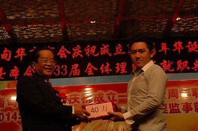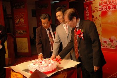 2014年1月1日,缅甸华商商会迎来105周年华诞,下午六时,在其会所礼堂举行盛大联欢宴会,以及该会等三十三届理监事就职典礼。中国驻缅甸特命全权大使杨厚兰及大使馆各级领导、缅中友好协会会长吴盛温昂、荣誉会长吴索拉敏以及缅中友好协会常务理事们、缅华各侨团代表们、第三十三届理监事们以及荣获本年度高考优等学科的本会会员直系子孙。筵开四十席,场面热闹非常。