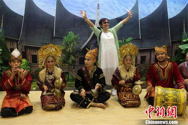 观展市民与身着印度尼西亚传统服饰的表演者合影。 陈秋霞 摄