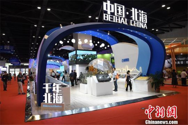 中国北海市以一艘乘风破浪的巨轮形象亮相东博会。 俞靖 摄