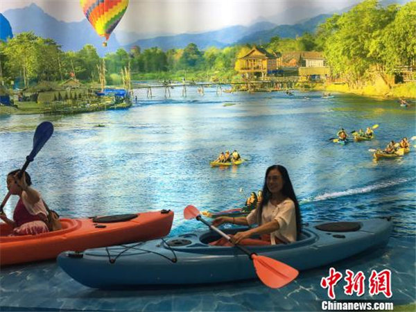 在老挝“魅力之城”展区,市民坐在小船上划桨,仿佛穿越到了风景宜人的万象省。 陈秋霞 摄