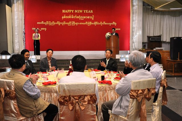1月14日下午六时,德宏州贸易商会驻缅甸商务代表处于曼德勒东方屋大酒店举行新年招待宴会,邀请了曼德勒省政府官员、中国驻曼德勒总领事馆郁伯仁总领事及各位领事、缅华社会各侨团侨领、华校代表、曼德勒工商会、缅中友好协会、曼德勒中资企业商会等代表共进晚餐。