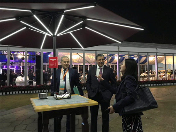 当得知汉伞可以通过伞上的薄膜太阳能发电,所发电能不仅可以提供给伞下的LED灯进行照明,还可以通过伞柄上的USB接口给手机充电时,老挝能源部的参会人员纷纷拿出手机亲自体验汉伞手机充电的功能。当手机和汉伞通过数据线连接,电量一点点地增加时,连国际可再生能源署总干事阿德南-阿明也不由得称赞到汉能“黑科技”的神奇力量。
