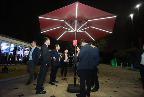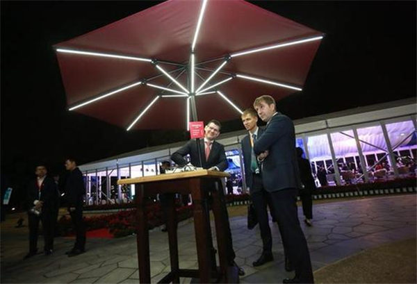 在本次活动中,汉能带来了全球首款基于柔性薄膜太阳能技术的多功能伞——汉伞。这只不仅可以遮阳挡雨,还能照明充电的红伞,一经亮相,就吸引了一大波参会嘉宾围观和热议。“之前觉得太阳能是又大又重,但是汉能的薄膜太阳能芯片却像纸一样轻薄柔”缅甸电力和能源部部长吴温楷赞叹。