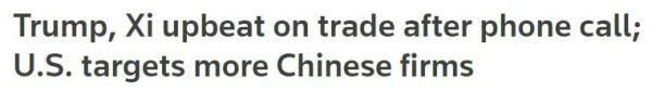在最新一篇报道中,路透社指出,就在中美元首通话几个小时后,美国司法部就以“知识产权盗窃”等理由对几家中国公司发起诉讼。
