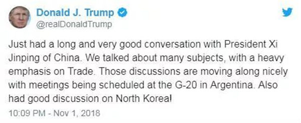 “刚刚同中国国家主席习近平进行了长时间和非常良好的交谈。我们谈论了很多话题,着重讨论了贸易问题,”特朗普在推特写道,“这些讨论正在顺利进行。”