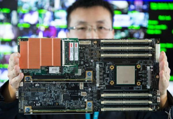 ▲资料图片:去年12月举行的北京智能计算产业研究院举行的发布会上,工作人员在现场展示高通量人工智能一体机的核心部件。(新华社)