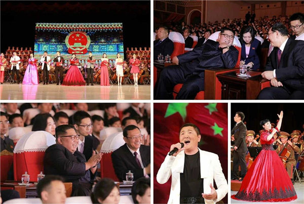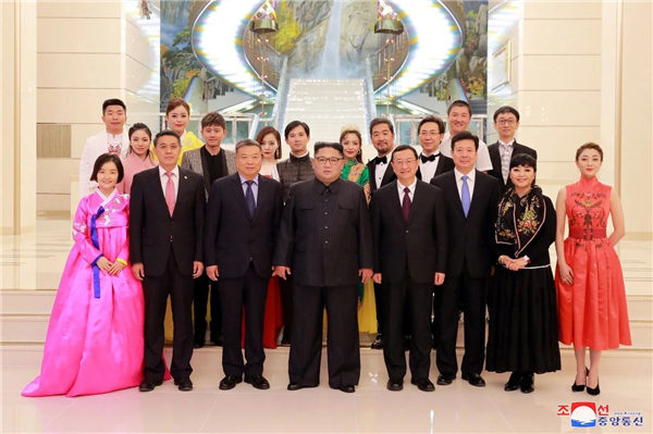 据朝鲜媒体报道,陪同金正恩观看演出的包括了朝鲜劳动党中央第一副部长金正恩的胞妹金与正。金正恩抵达剧场时,中国文艺工作者向金正恩献上鲜花。金正恩对中国艺术家代表团访问平壤表示欢迎,并与各位成员一一握手。金正恩说,中国知名艺术家满怀着友谊之情来到平壤,给朝鲜人民带来了无比的欢乐。他期待和相信,中国文艺工作者代表团的此次访朝,将成为进一步推进中朝友谊的重要契机,并同代表团成员合影留念。