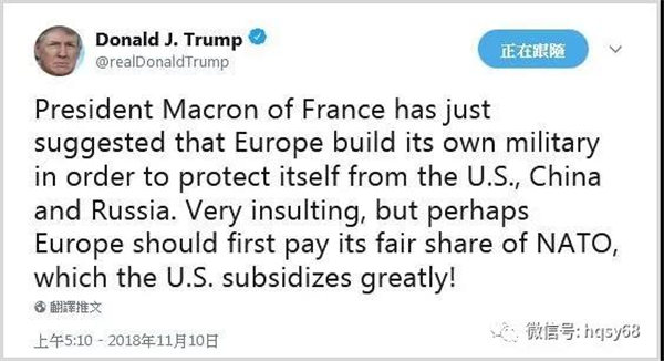 法国总统马克龙刚刚建议,欧洲应该建立自己的军队,保护自己不受美国、中国、俄罗斯的侵犯,非常侮辱人,但也许欧洲应该首先支付北约的合理费用,美国补贴得太多了!