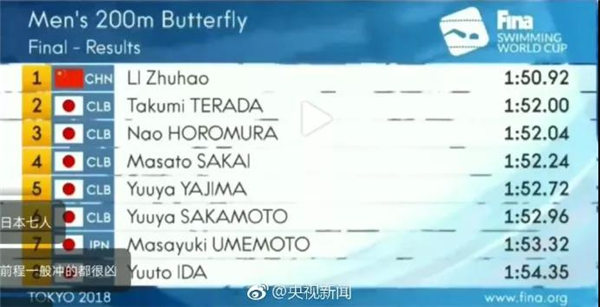 11月10日,国际泳联游泳世界杯东京站第二比赛日上演神奇一幕,男子200米蝶泳决赛,八条泳道里有七名日本选手,中国19岁小将李朱濠成为唯一的例外。