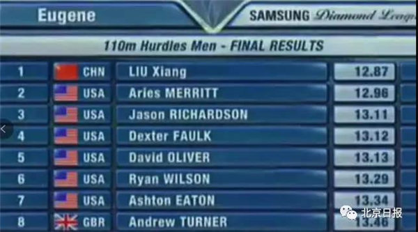 最终,刘翔在比赛中以12秒87的成绩勇夺冠军,同时一次性力压6大美国对手的故事也被写进了教科书中。