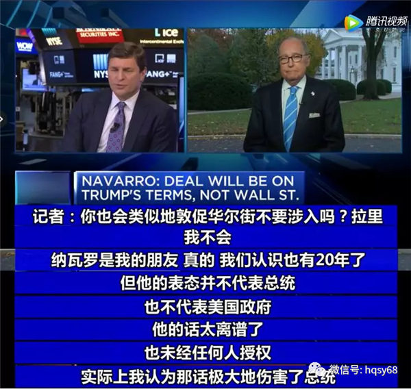 纳瓦罗在本月9日公开警告华尔街不要干预贸易谈判,而库德洛立马打脸,声称纳瓦罗的表态是“自言自语”、“大错特错,给总统帮倒忙”、“(纳瓦罗)不代表美国政府”。